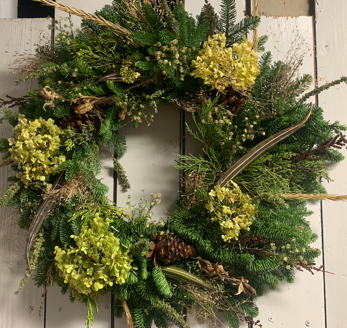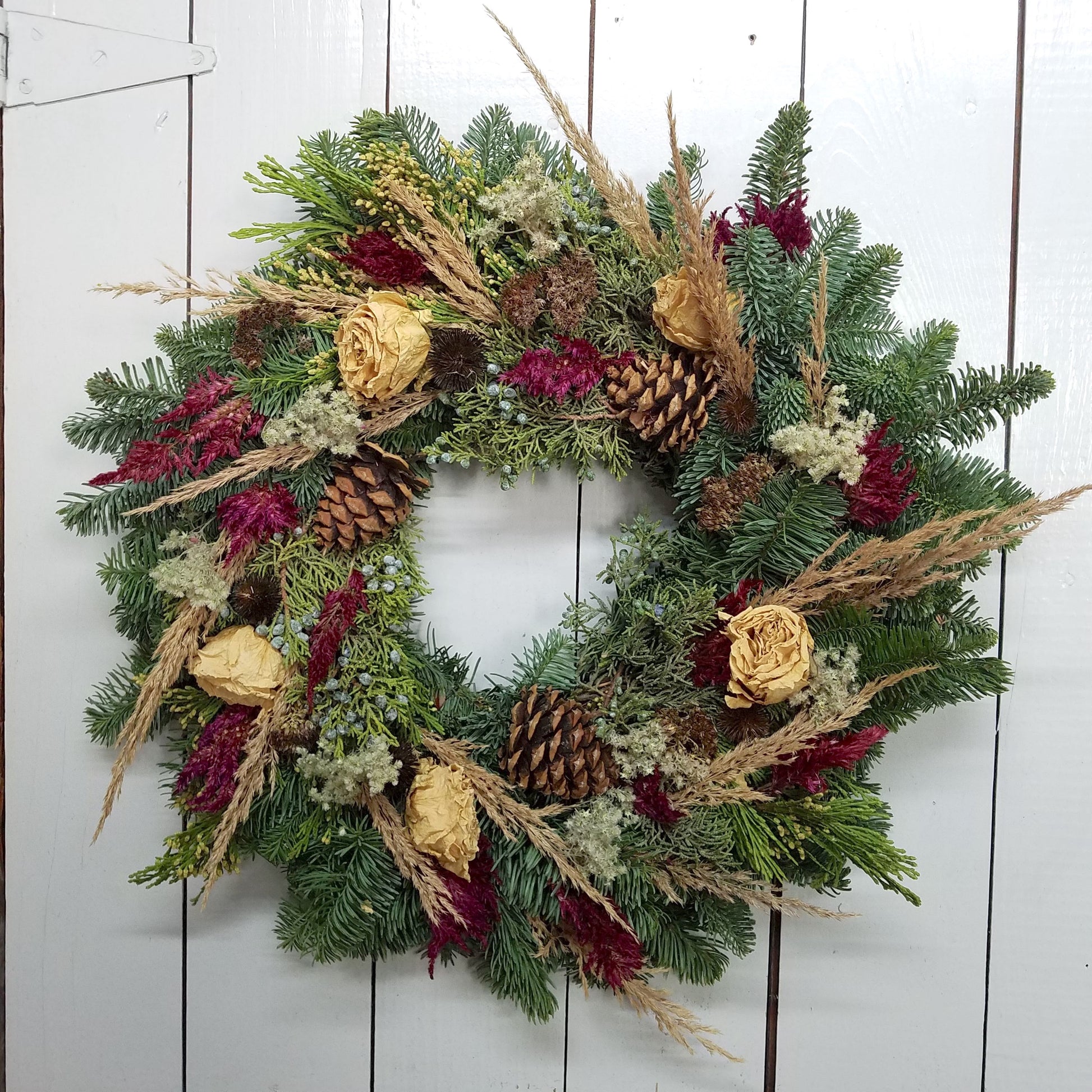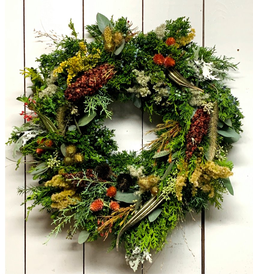 This collection of dried flowers from our local gardens and fresh evergreens are carefully packed into a festive display! Measures roughly 21 inches in diameter (on a 10-inch base); sizes and style will vary slightly due to the handmade one-of-a-kind nature of the wreaths.